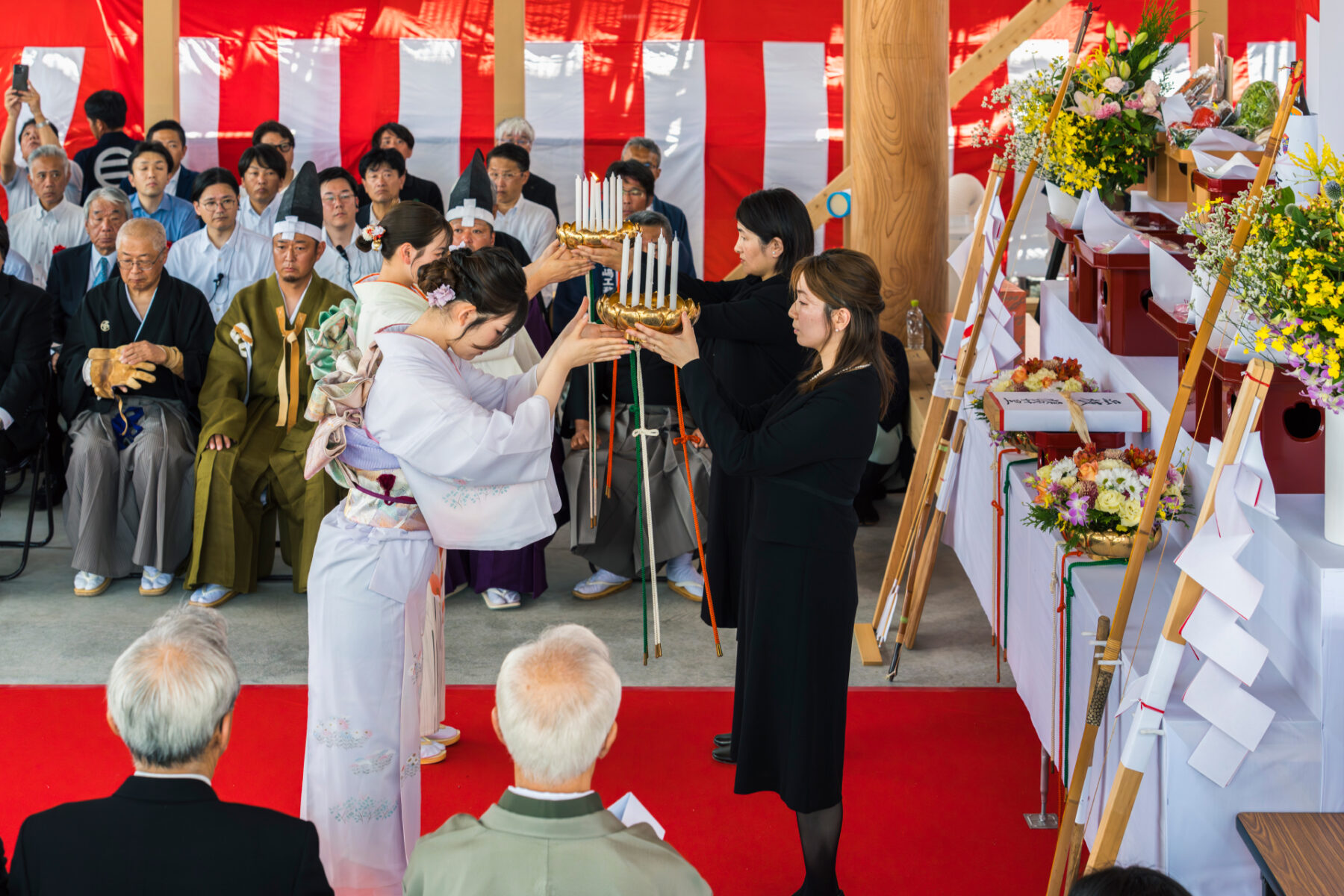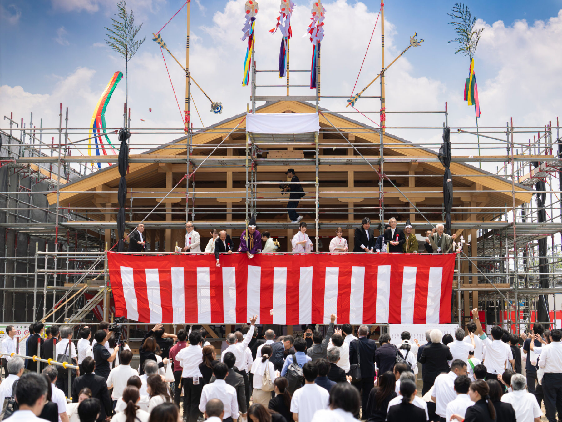 会議棟を施工する株式会社西嶋工務店(西嶋靖尚代表取締役、宮大工大都流 第三十二代当主)による、宮大工大都流の古式にのっとった「上棟の儀」が執り行われ、参列者とご列席者の皆様一同で施設の無事完成を祈願いたしました。