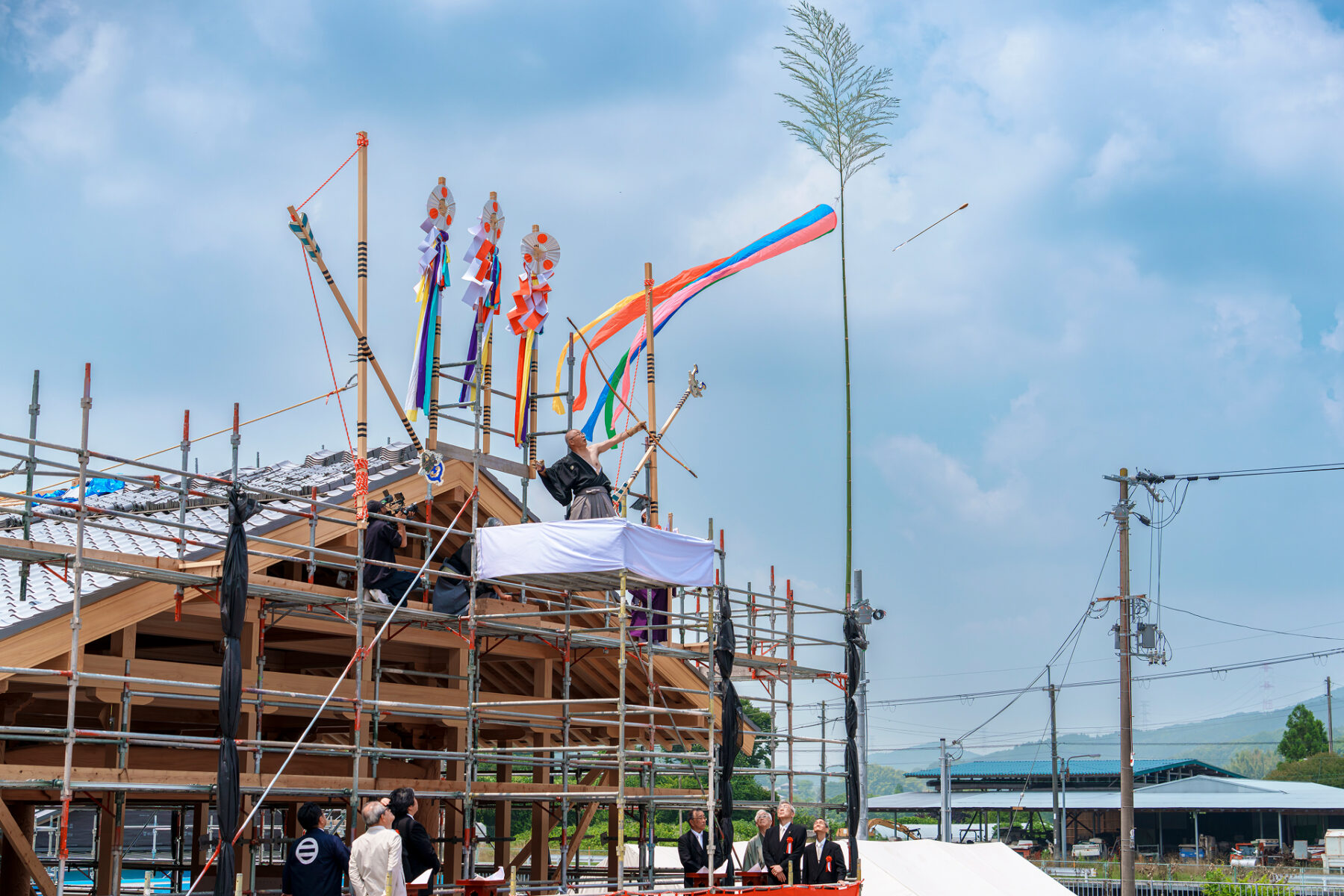 上棟式には、地元の皆様や金剛一智宇陀市長等、施工関係者、弊社関係者を含め182名が参加。式中では、今回施工を手掛けた株式会社西嶋工務店(兵庫県姫路市 西嶋靖尚代表取締役、宮大工大都流第三十二代当主)による、宮大工大都流の「上棟の儀」が執り行われ、大空に向かって矢が放たれる勇壮な「破魔弓作法」など、めったに見ることができない古式に則った儀式に、参列した方々も見入っていました。