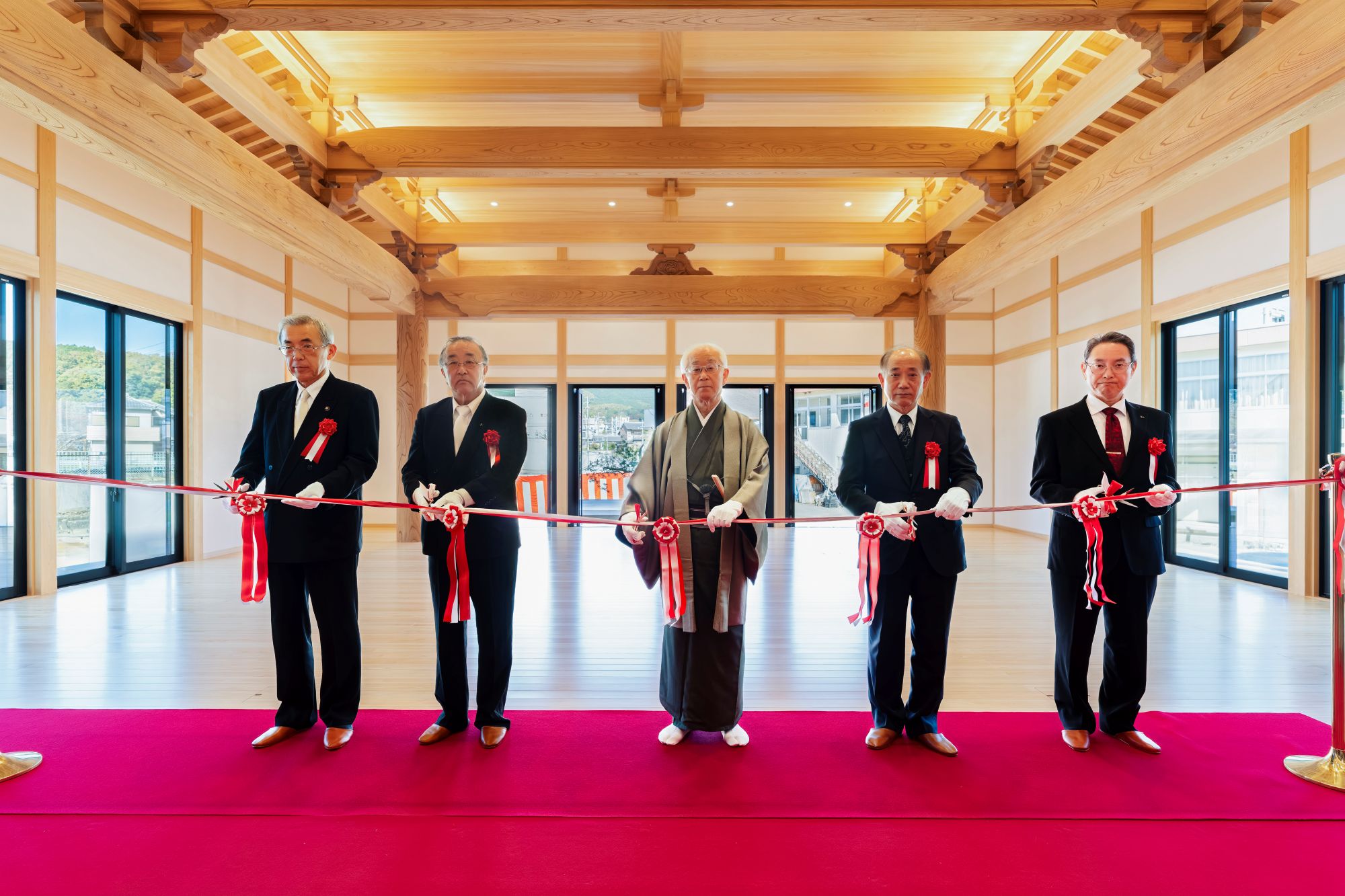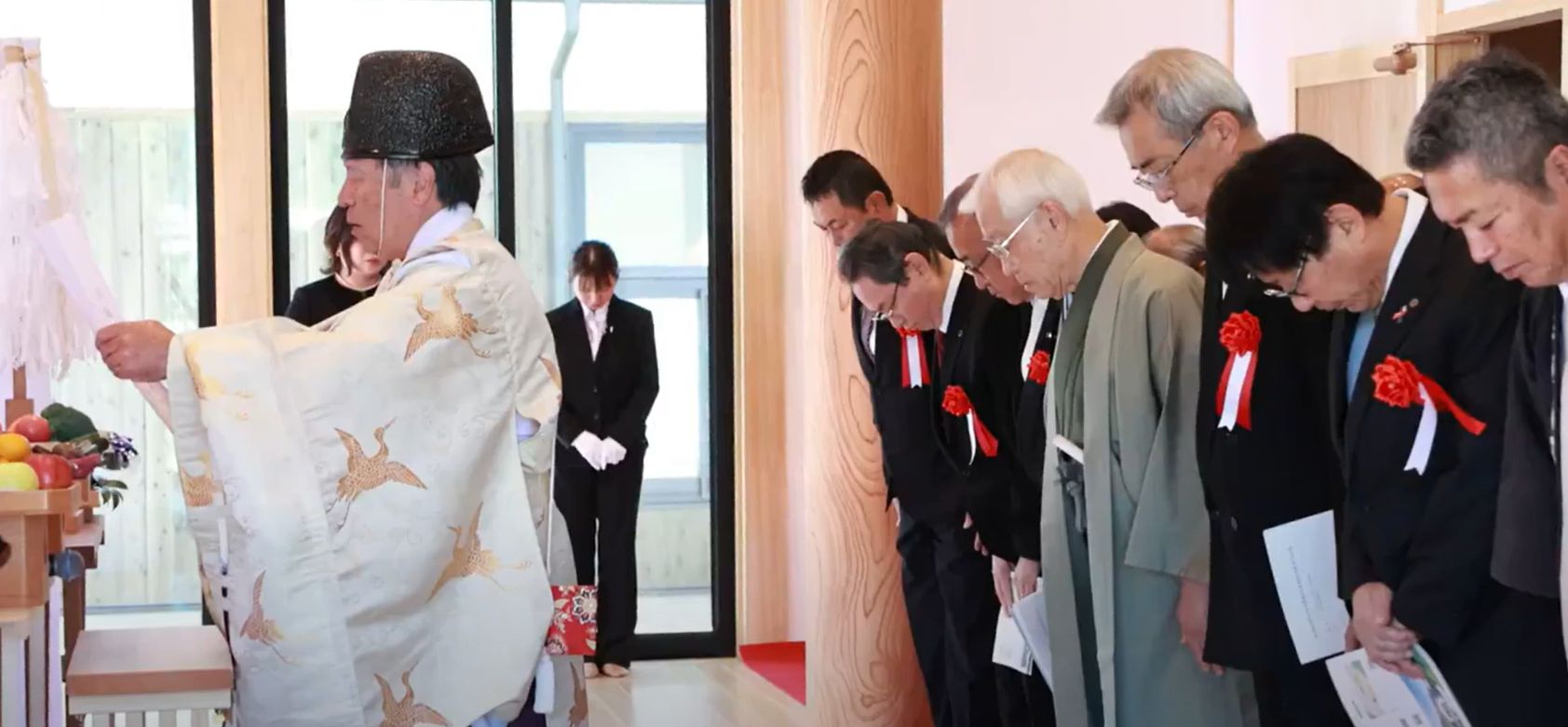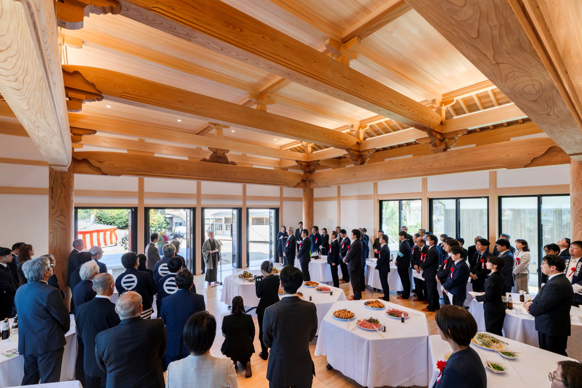 当日の竣工式には、弊社代表取締役社長・阿部 紘を筆頭に、社員、施工関係者、金剛一智宇陀市長など、地元関係者を含む約100名が出席。神前に向かって建物完成の報告と今後の安全、永年の繁栄を願い、儀式を執り行いました。